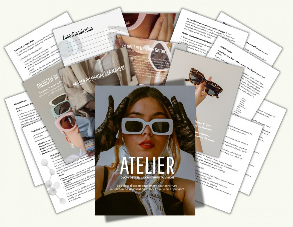 Ce guide inclut également des sections d'inspiration, des espaces de réflexion, des outils concrets et même un petit extra Glow Getter pour aller encore plus loin. C'est l'atelier parfait si tu veux créer ton vision board avec intention, douceur et puissance ? en solo, avec ton équipe ou même en groupe.
